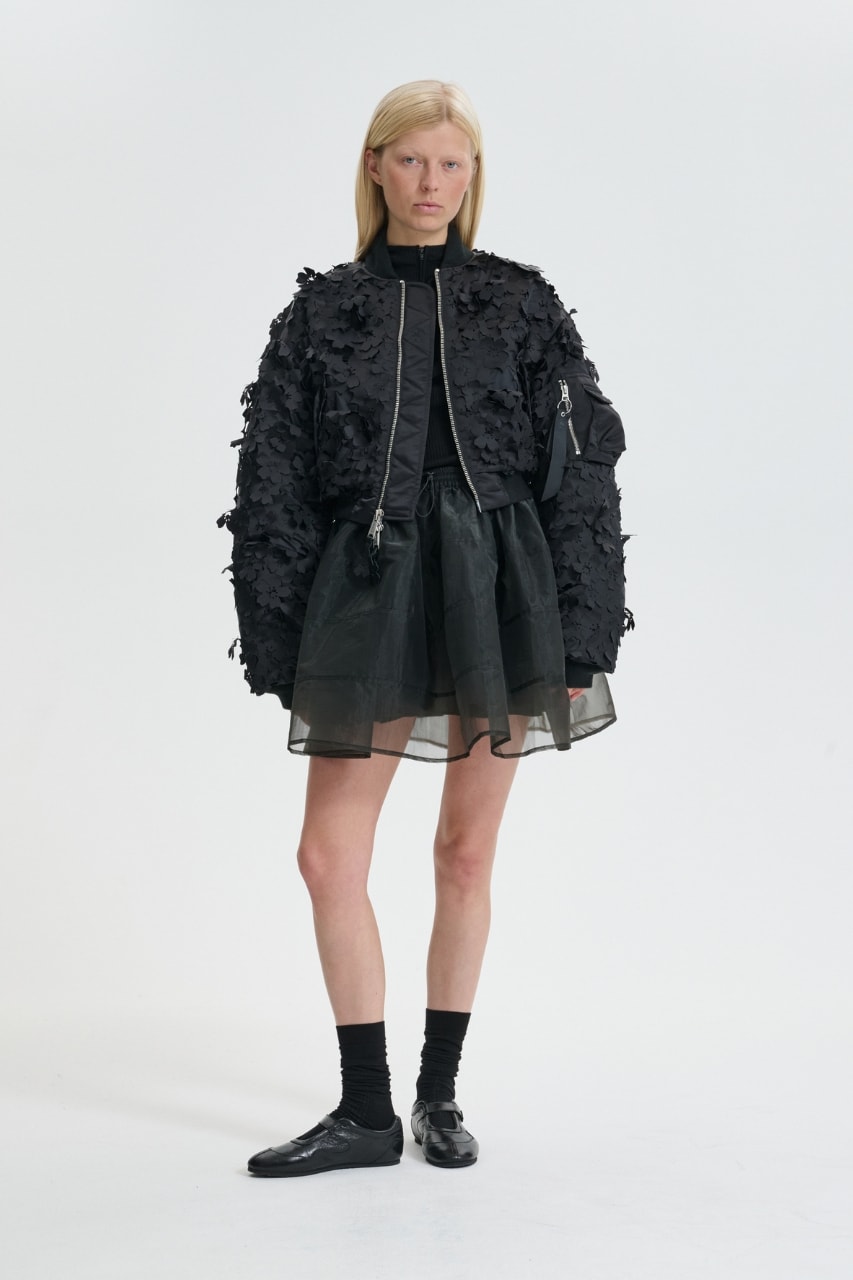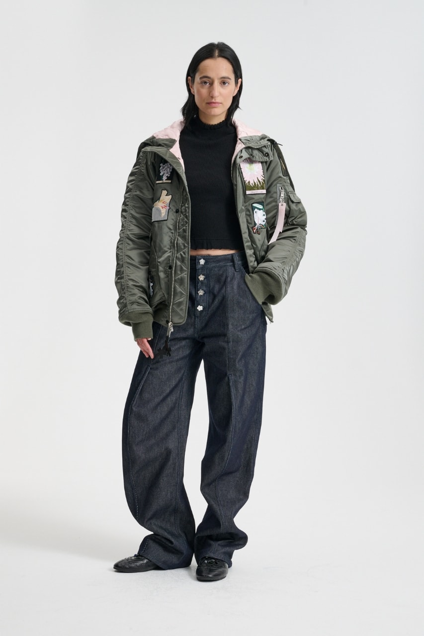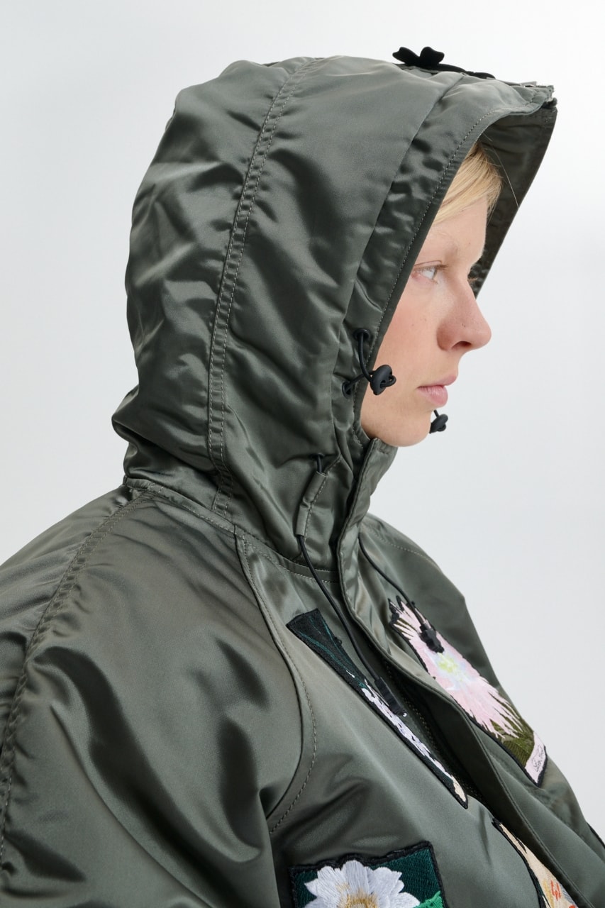 Rather than stripping away its original identity, the collection builds on Alpha Industries’ heritage, introducing floral elements, textured fabrics and sculptural volume to a traditionally military-inspired piece.