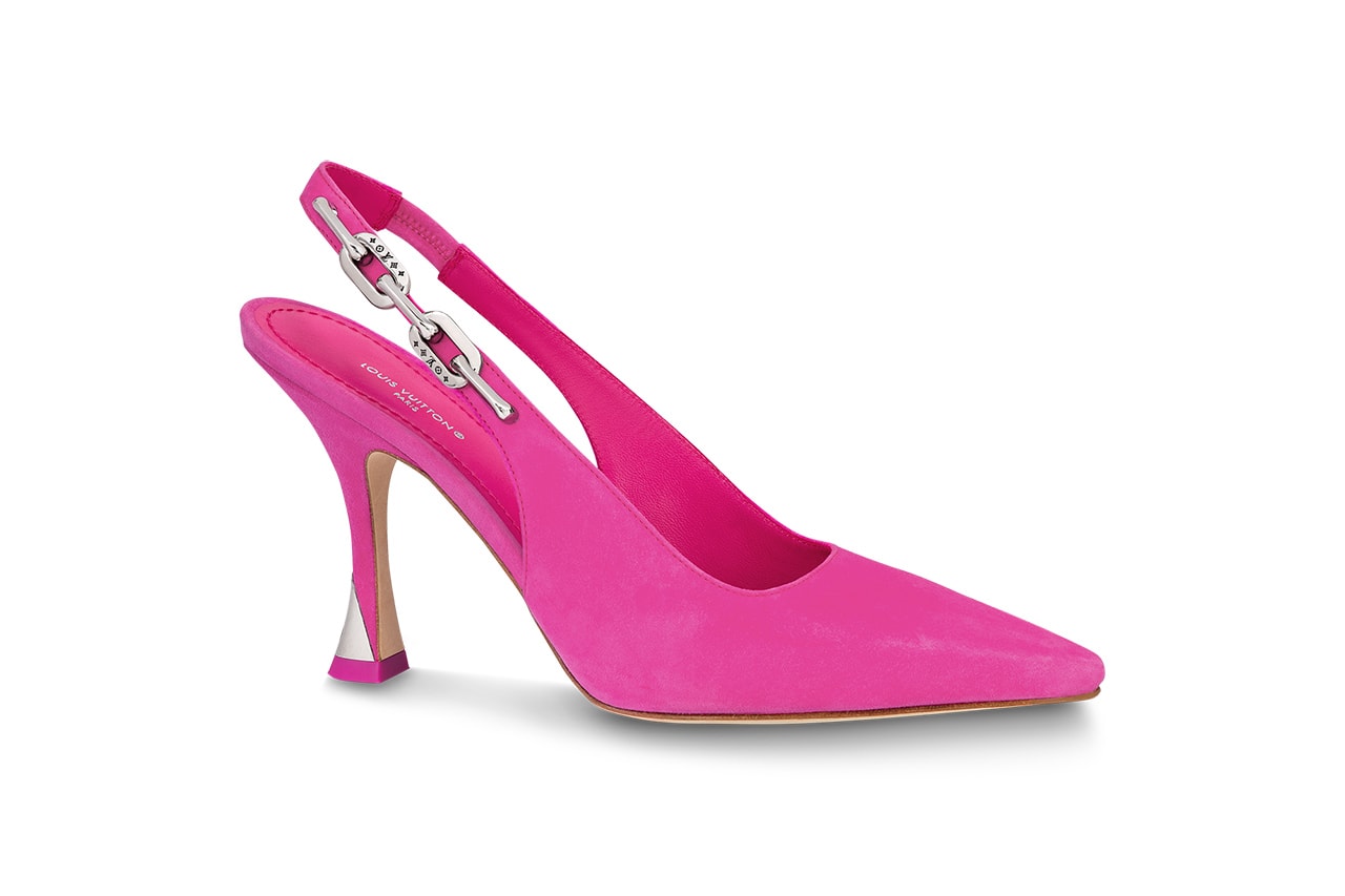 Новий каблук натхненний культовою сумочкою Coussin із шикарним кріпленням, підкресленим розкішним ланцюжком із вигравіруваним монограмою. Надзвичайно жіночні туфлі виготовлені з надзвичайно м’якої телячої шкіри та доступні в різних стилях, щоб підійти різним користувачам, починаючи від шкіри, замші, стразів і привабливого варіанту з паєтками. Нове вечірнє взуття також має загострений носок і розкльошені каблуки, які прикрашені металевою вставкою з вигравіруваним підписом LV Circle.