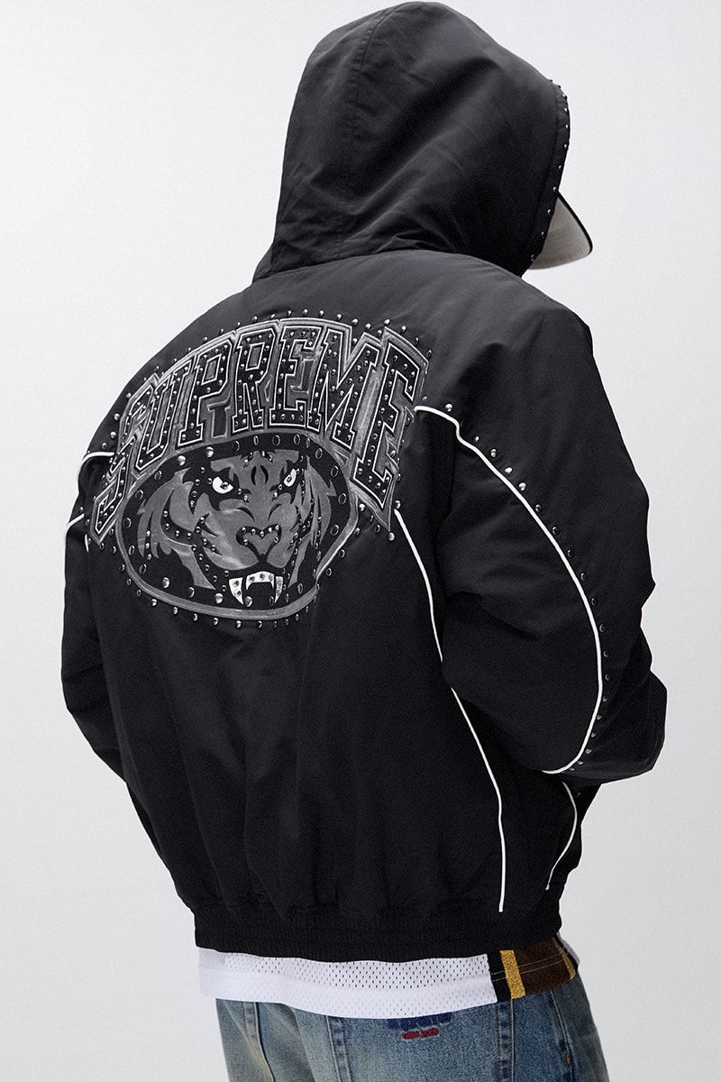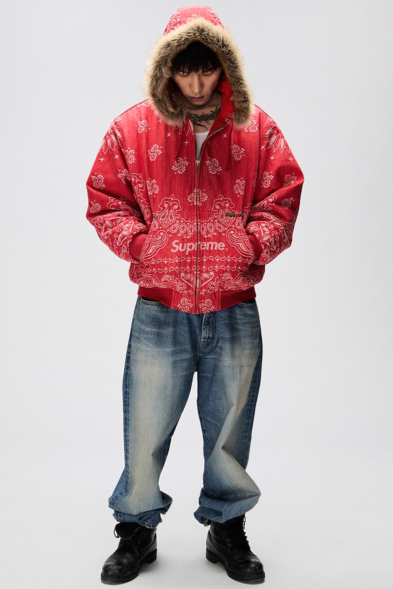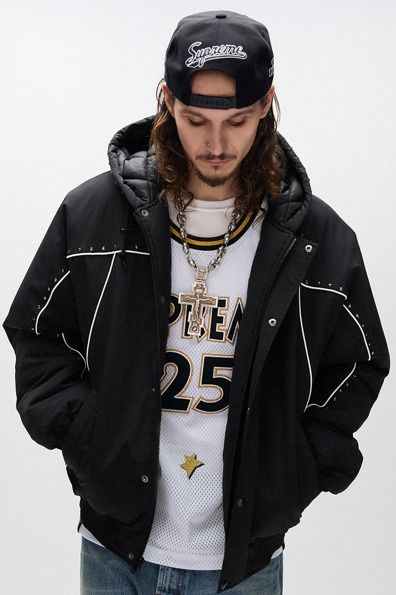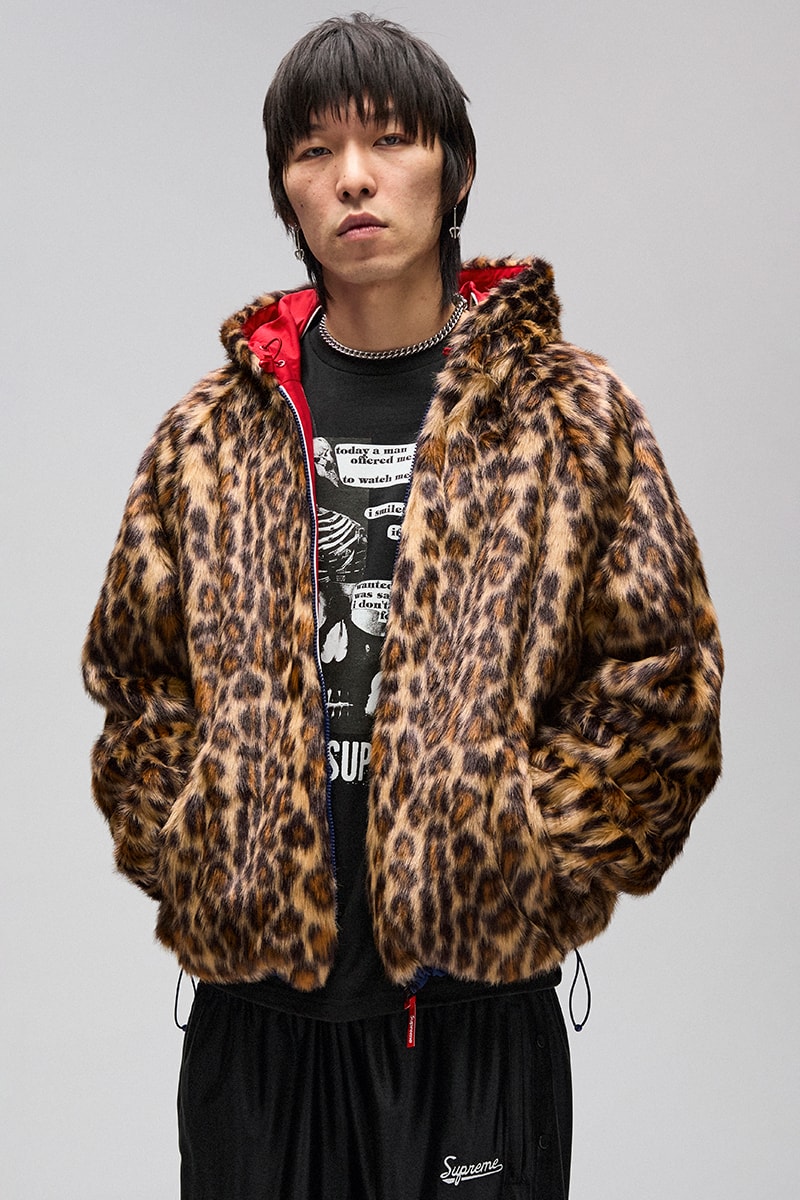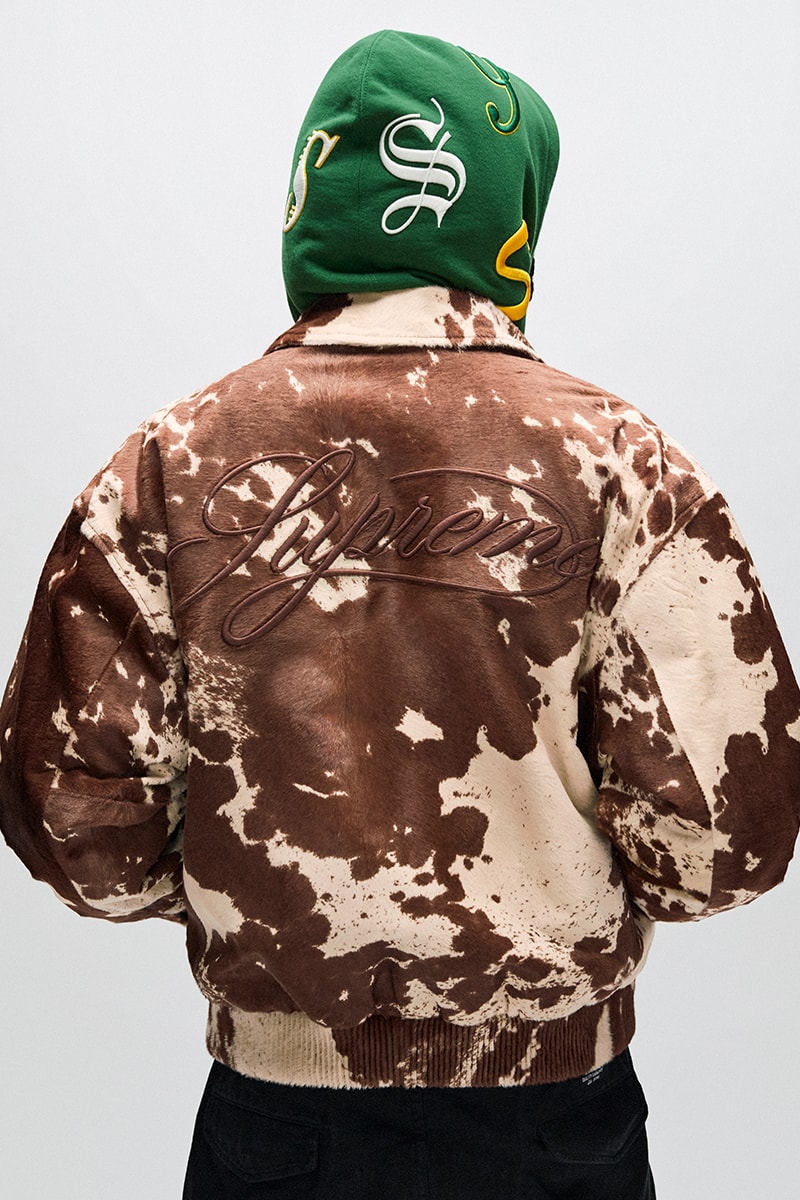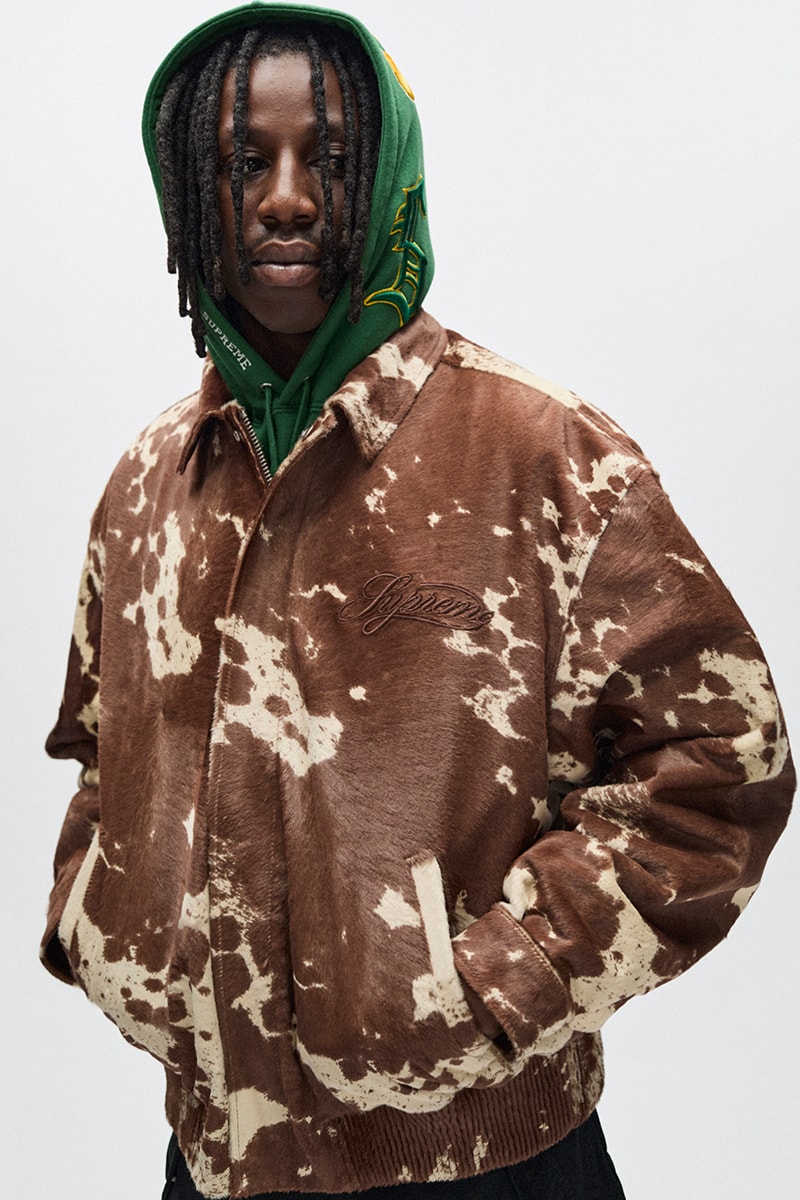 The SS25 lineup includes a diverse selection of jackets, shirts, sweaters, hoodies, tees, pants, shorts, hats, bags, and accessories, incorporating unique materials and standout designs. Highlights include leather and cow-print jackets as well as windbreakers, each reflecting Supreme’s signature bold aesthetic. Art takes center stage in the collection, featuring pieces adorned with Damien Hirst’s iconic works, including The Physical Impossibility of Death in the Mind of Someone Living and The Black Sheep with the Golden Horn. Additional artistic elements come from Ernie Barnes, whose celebrated paintings The Sugar Shack and Main Street Pool Hall appear on select garments. Contributions from AOI, Sean Cliver, and Mario Ayala further enrich the collection’s visual appeal.