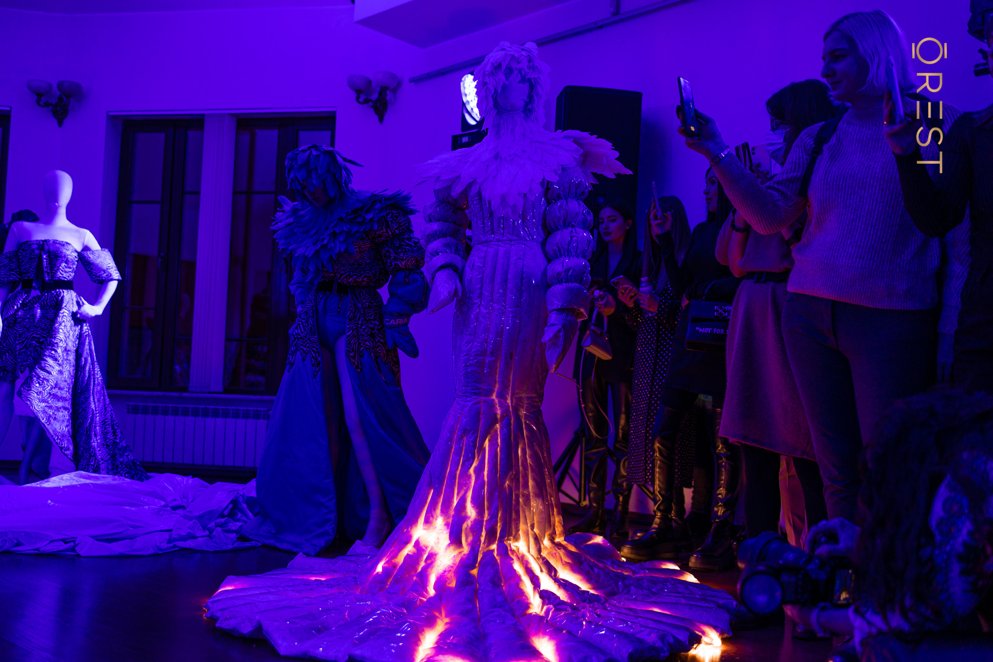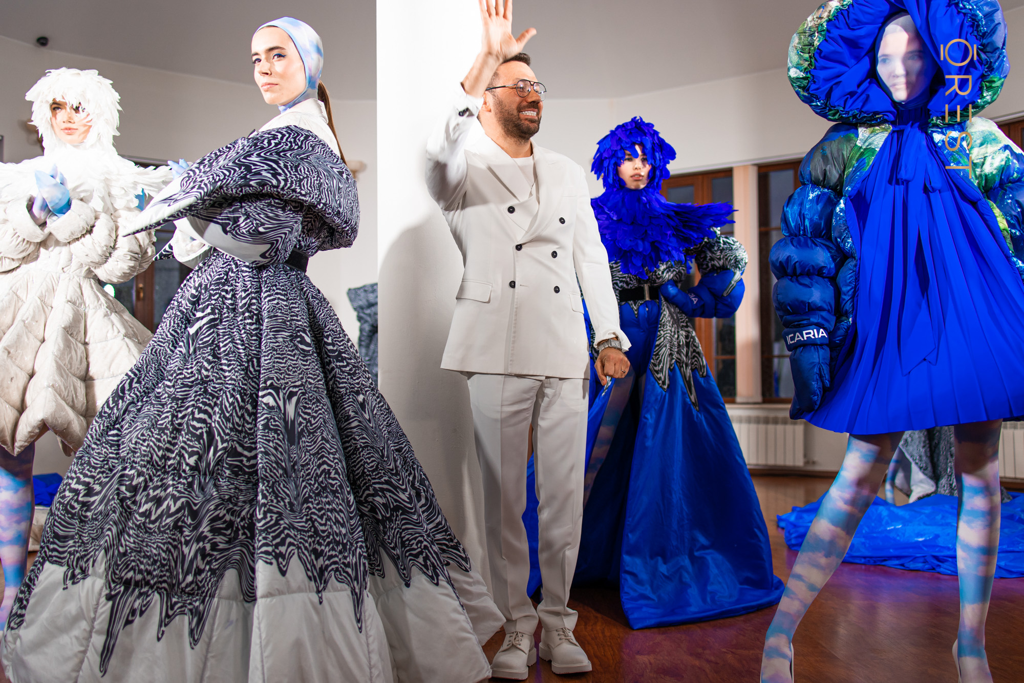 Каждый из образов коллекции символизирует тот или иной фрагмент истории и напоминает скорее работы в музее современного искусства, чем одежду в привычном понимании. Белоснежное платье из пуха, словно вырастающее из подола-основания – аллюзия на статуи древнегреческих богов, которыми прославился Дедал. Эффектные головные уборы из перьев – переосмысленные крылья. Светящиеся изнутри пышные юбки – такое желанное и одновременно беспощадное для Икара солнце. Синий цвет – это небо и море.