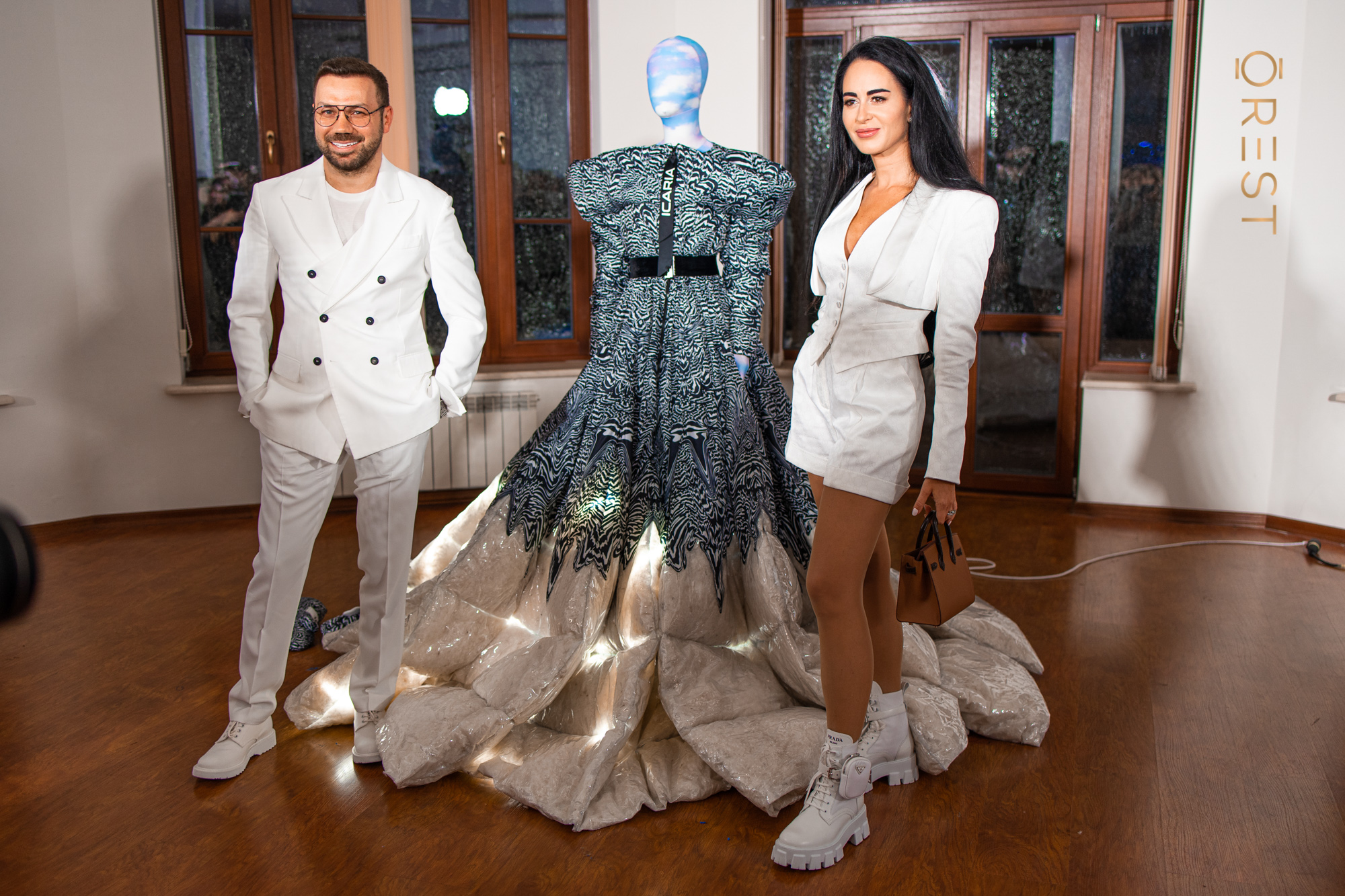 «Выбирая темой коллекции миф об Икаре, я понимал, что основным материалом должны стать перья. Они использованы не только в качестве декора, но и как экологически чистый наполнитель. И дабы сделать эту историю максимально sustainable, мы решили обратиться за расходным материалом к компании, для которой перо является неотъемлемой частью производственного процесса, но не основным продуктом. Так партнером этого арт-эксперимента стал бренд компании МХП - «Наша Ряба», - говорит Андре.