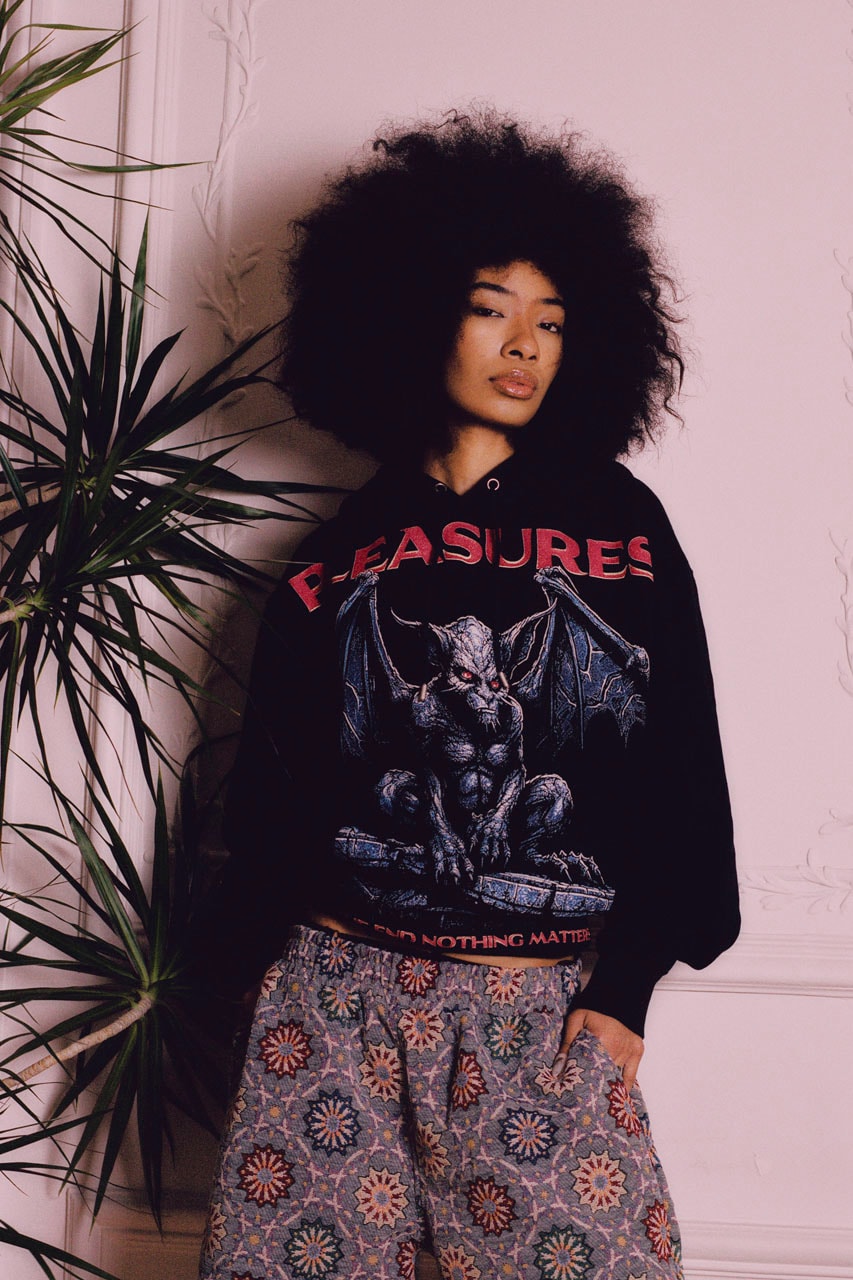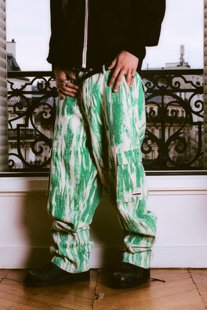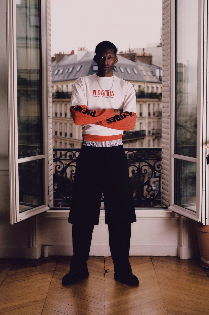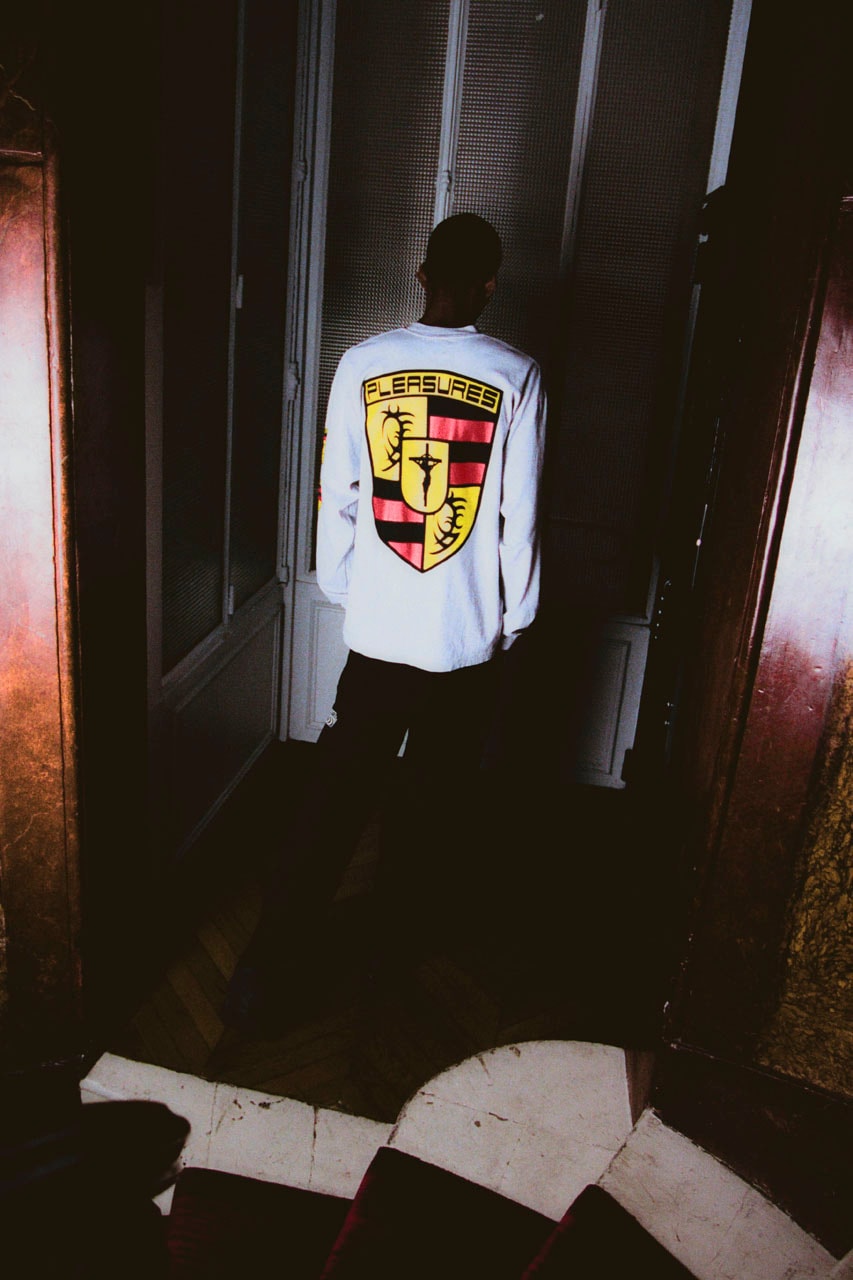 Принти домінують у всій колекції: смугаста сорочка з оксфордської тканини з градієнтом блакитного та рожевого кольорів, джинси, вкриті логотипами PLEASURES. Серед аксесуарів — сонцезахисні окуляри та друковані парасольки.