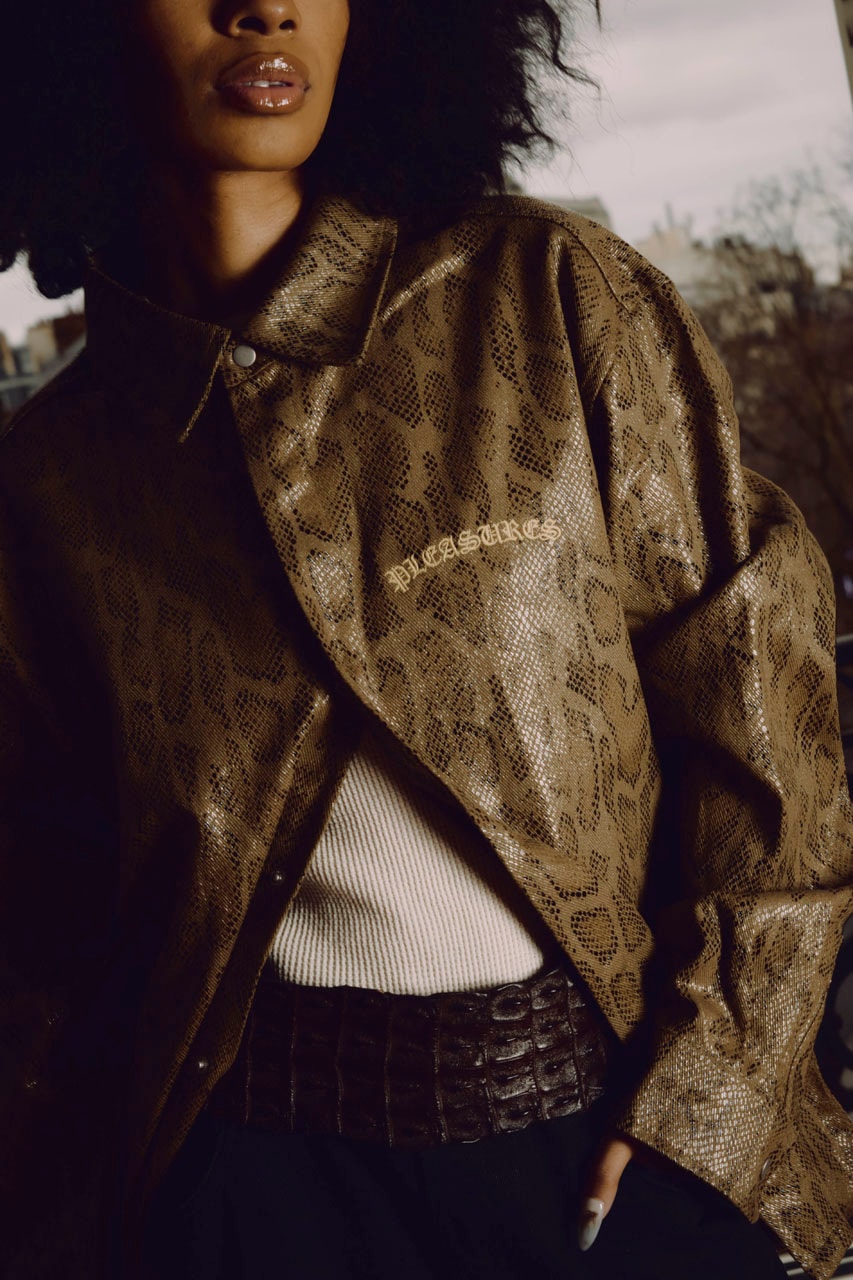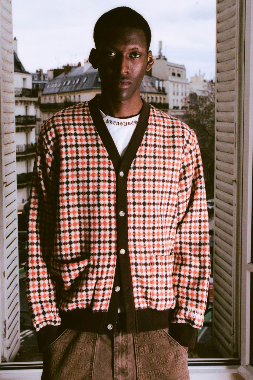 У менш функціональному ключі PLEASURES також представив оливкову сорочку зі шкіри під змію та червоний блейзер із леопардовим принтом. В'язані речі також займають важливе місце: у колекції з'явився смугастий светр у червоно-жовто-зеленій гамі та яскравий кардиган на гудзиках.
